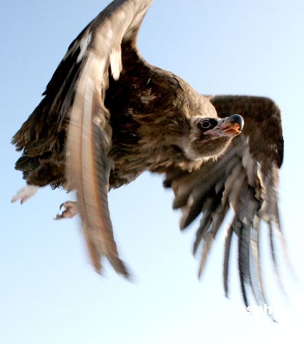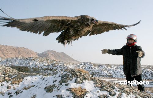 2008年2月2日,新疆哈密地區(qū)野生動(dòng)植物保護(hù)辦公室的一名工作人員在放飛禿鷲。07年12月初,新疆哈密的一名民工將一只受重傷國(guó)家二級(jí)保護(hù)動(dòng)物禿鷲送到新疆哈密地區(qū)野生動(dòng)植物保護(hù)辦公室進(jìn)行救治。2月2日,完全恢復(fù)健康的禿鷲被放歸大自然。 據(jù)介紹, 禿鷲又名座山雕、狗頭鷲,分布在我國(guó)的新疆、青海、甘肅、寧夏、內(nèi)蒙古等地。它們屬于大型猛禽。全長(zhǎng)約110厘米。身體的羽毛主要呈黑褐色。主要以鳥(niǎo)獸的尸體和其他腐爛動(dòng)物為食。中新社發(fā) 普拉提 攝