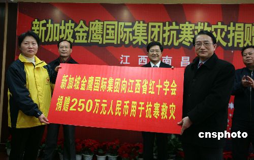 2月3日,正在遭受五十年罕見的冰雪災(zāi)害的江西省收到了首筆海外僑胞的救災(zāi)捐款250萬元人民幣,該筆捐款由中國僑商投資企業(yè)協(xié)會常務(wù)副會長、新加坡金鷹國際集團主席陳江和慷慨解囊,以幫助受災(zāi)民眾度過難關(guān)。中新社發(fā) 吳慶才 攝