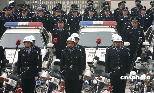 2月3日,公安警察莊嚴宣誓。當日,重慶永川區(qū)公安局舉行“2008東亞女足錦標賽安保工作誓師大會”,全局500名干警參加了誓師大會,確保治安環(huán)境,確保女足錦標賽順利舉行。中新社發(fā) 陳仕川 攝