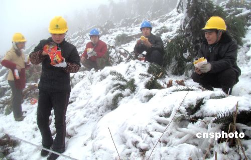 2月3日,電力工人在搶修110KV線(xiàn)路。1月17日以來(lái),四川瀘州敘永遭遇百年不遇的雨雪冰凍災(zāi)害,導(dǎo)致11萬(wàn)千伏倒桿斷線(xiàn)2KM,10千伏斷線(xiàn)426KM,380伏斷線(xiàn)937KM,高壓倒桿142余根,低壓倒桿485余根,變壓器約25臺(tái)受損。為盡快搶通線(xiàn)路,電力工人們風(fēng)餐露宿、加班加點(diǎn)。 中新社發(fā) 黃虎 攝