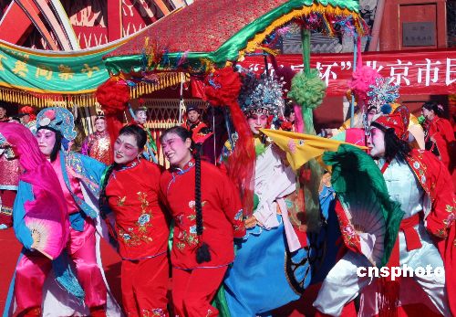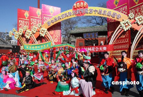 2月6日,“第七屆北京民俗文化節(jié)暨第十屆東岳廟春節(jié)文化廟會(huì)”在喜慶熱烈、歡樂(lè)祥和的氛圍中開鑼。東岳廟作為北京奧運(yùn)會(huì)主場(chǎng)館所在地朝陽(yáng)區(qū)唯一的民俗類專題博物館,是次廟會(huì)以“祈福納祥迎奧運(yùn)”為主題,活動(dòng)內(nèi)容精彩紛呈,既有傳統(tǒng)的非物質(zhì)文化遺產(chǎn)展示,亦有新增加的民俗活動(dòng)“請(qǐng)福牌”、“畫福布”、“請(qǐng)五!薄ⅰ皰毂P香”等活動(dòng)。同時(shí)“東岳杯”朝陽(yáng)區(qū)民間花會(huì)大賽的11個(gè)區(qū)縣、32檔花會(huì)也同臺(tái)競(jìng)技。中新社發(fā) 錢興強(qiáng) 攝