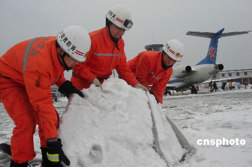 2月4日至5日,貴州銅仁地區(qū)公安消防、武警、民兵應(yīng)急分隊600余人出動裝載機、推土機、清雪車和灑水車,在銅仁大興機場使用消防水槍清除跑道冰雪,以確保機場在2月6日恢復(fù)通航。背景資料:貴州銅仁地區(qū)大興機場是貴州第一個支線機場,現(xiàn)已開通直接往返北京、廣州、深圳、重慶、貴陽、長沙等大中城市的航班。據(jù)悉,該機場從1月12日遭受嚴重凝凍天氣以來停航至今。中新社發(fā) 陳曉嵐 攝