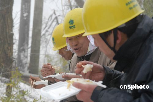 2月6日下午1點(diǎn),新昌城關(guān)供電營(yíng)業(yè)所城區(qū)供電服務(wù)班班長(zhǎng)梁雍和他的隊(duì)員們一起在施工現(xiàn)場(chǎng)吃中飯。當(dāng)日,浙江新昌縣供電局城關(guān)供電營(yíng)業(yè)所的員工在該縣城南鄉(xiāng)搶修秦巖177線,目前,新昌有35個(gè)行政村因雪災(zāi)尚未通電,561名電力搶修隊(duì)員仍?shī)^戰(zhàn)在搶修一線。據(jù)悉,電力工人們?yōu)樵缛胀姡暌癸堃仓荒茉谏缴铣粤。中新社發(fā) 袁云 攝