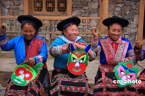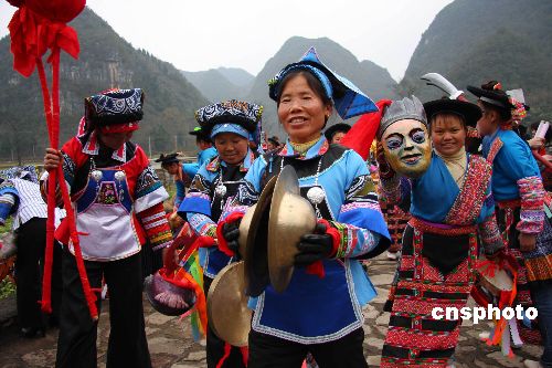 2月8日,大年初二,貴州省興義市間歇泉民族村布依族、苗族風情演出隊在表演自編自導的民族舞蹈。當日,貴州省興義市間歇泉民族村村民自發(fā)在村里組織了一臺自編自導的民族風情表演及體育活動,拉開了山寨鬧新春,迎奧運的序幕。中新社發(fā) 韋波 攝