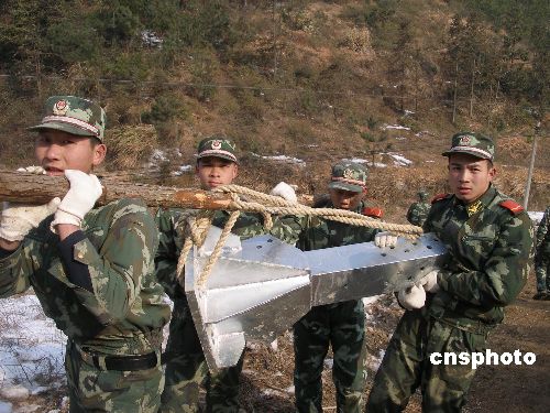 2月8日,湖南省婁底市武警支隊(duì)100多名武警官兵冒著風(fēng)雪和山高路滑,每天將近20噸電力鐵塔的部件分散運(yùn)送到湘鄉(xiāng)市壺天鎮(zhèn)山上進(jìn)行線路搶修。中新社發(fā) 郭國權(quán) 攝