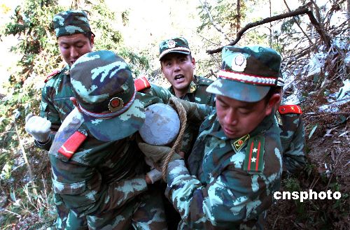 2月13日(農(nóng)歷年初七),麗水市武警支隊(duì)官兵在搬運(yùn)水泥電線(xiàn)桿。浙江麗水市云和縣安溪畬族鄉(xiāng)東岱村在海拔700米以上,在今年遭遇的雪災(zāi)中,電力線(xiàn)路中斷了20余天。當(dāng)天麗水市武警支隊(duì)60多名官兵經(jīng)過(guò)3天奮戰(zhàn),在冰雪地搬運(yùn)了36根水泥電線(xiàn)桿,幫助電力職工搶修線(xiàn)路。中新社發(fā) 歷記攝 攝