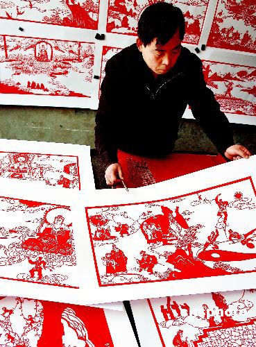 2月14日,河南鄭州高新區(qū)石佛村農(nóng)民黃建軍展示自己歷時4年制作的、總長約160米的《西游記》巨幅連環(huán)畫,并準備將其獻給2008年奧運會。據(jù)了解,該連環(huán)畫由210張畫組成,故事取材于西游記原著,每個章節(jié)最多用7到8張來表現(xiàn),從2003年開始創(chuàng)作,耗時約4年,僅起稿就花費近1年半時間,每張要“剪”兩三天的時間。中新社發(fā) 馬健 攝