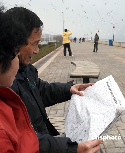 2月18日,兩位云南省昆明市民在滇池邊看報(bào)紙上刊出的昆明官員聯(lián)系方式。日前,昆明市決定向社會(huì)公布該市官員職務(wù)分工情況和聯(lián)系電話,《昆明日?qǐng)?bào)》整版公布信息后受到昆明市民熱烈搶購。中新社發(fā) 李一波 攝