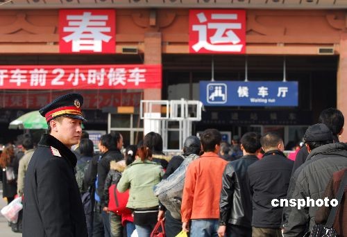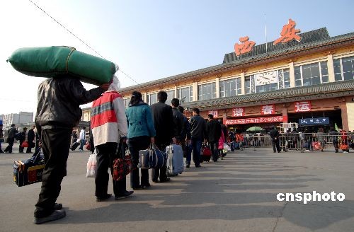 2月19日,旅客在西安火車站排隊有序進站乘車。元宵節(jié)將至,外出民工與返校學生流、探親流等客流全面啟動,西安火車站客流持續(xù)攀升。鐵路部門采取提前二小時進站、在廣場設(shè)立臨時候車區(qū)等措施,做好旅客乘車組織及服務(wù)工作,確保客流高峰安全、平穩(wěn)、有序。中新社發(fā) 唐振江 攝