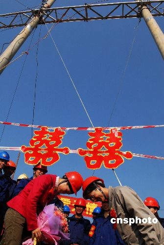參加救災(zāi)的一對(duì)電網(wǎng)職工電線桿下舉行婚禮
