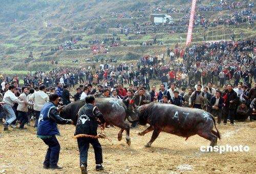 3月2日,2008貴州省開陽縣高寨苗族布依族鄉(xiāng)平寨斗牛節(jié)揭幕。來自十里八鄉(xiāng)的苗族、布依族同胞身著節(jié)日盛裝,聚集平寨村天然的斗牛場,吹起蘆笙,載歌載舞,一睹斗牛賽、斗雞、撥河、苗族舞蹈、刺繡、紡織等比賽的精彩表演。中新社發(fā) pengnian 攝