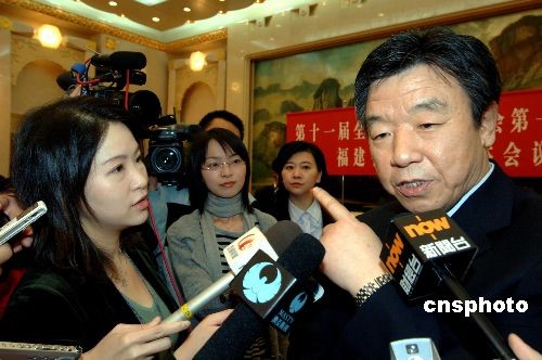 三月七日,十一屆全國(guó)人大一次會(huì)議福建代表團(tuán)在北京人民大會(huì)堂討論政府工作報(bào)告,福建省委書記盧展工在接受中外媒體采訪時(shí)表示,福建對(duì)海峽兩岸“三通”已作好準(zhǔn)備。中新社發(fā) 王東明 攝