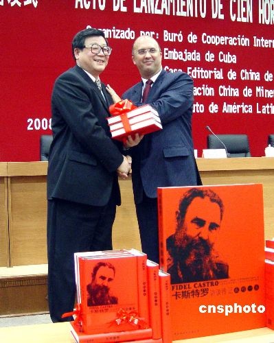 三月七日,古巴領(lǐng)袖菲德爾·卡斯特羅中文版自傳《卡斯特羅訪談傳記:我的一生》首發(fā)式在北京中國社科院舉行,他親自為該書撰寫了序言《致中國人民》,并在其中表示“在二十一世紀的世界形勢下,應(yīng)該依靠中國”。圖為中國社科院副院長王偉光向古巴駐華大使卡洛斯·米格爾·佩雷拉贈送中文版自傳。中新社發(fā) 應(yīng)妮 攝