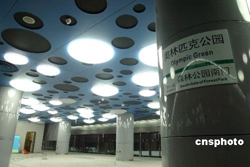 北京地鐵“奧運(yùn)支線”裝飾工程近日進(jìn)入收尾階段。該支線是北京地鐵線網(wǎng)中直接為奧林匹克中心區(qū)服務(wù)的骨干軌道交通線路,正線全長4.398公里,連接著奧林匹克中心站、奧林匹克公園站。圖為建在奧運(yùn)會(huì)主場館“水立方”之下的奧林匹克公園站,設(shè)計(jì)風(fēng)格融入諸多“水元素”。中新社發(fā) 富田 攝