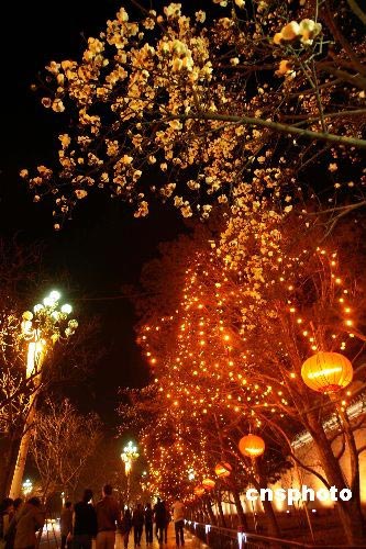 3月12日夜晚,一對(duì)情侶在北京西長(zhǎng)安街的紅墻外觀燈、賞花。兩會(huì)期間,北京長(zhǎng)安街紅燈籠高掛,與盛開(kāi)的玉蘭花相映,烘托出慶祝氣氛。中新社發(fā) 盛佳鵬 攝