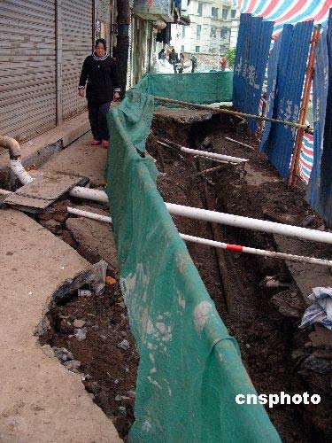 3月21日,湖北宜昌城區(qū)力行二街35號(hào)8層高的住宅樓豐澤苑地基發(fā)生陷塌后的現(xiàn)場(chǎng),施工方已將陷塌物部分清理后準(zhǔn)備對(duì)地陷進(jìn)行加固。據(jù)悉,3月19日晚,宜昌城區(qū)力行二街35號(hào)8層高的住宅樓豐澤苑地基突然發(fā)生陷塌,一些居民連夜撤離;陷塌處長(zhǎng)約10多米,寬約5米。居民們認(rèn)為,豐澤苑住宅樓5米外的地方有一塊正在開發(fā)的地基已挖了10多米深,正因這處較深的地基與豐澤苑住宅樓地基太近,才導(dǎo)致出現(xiàn)了陷塌險(xiǎn)情。豐澤苑住宅樓于2001年建成,住有40多戶居民(其中,一樓為商業(yè)門面),一個(gè)多月前,塌陷處的表面就已發(fā)現(xiàn)裂縫,施工人員曾對(duì)裂縫處作過灌漿處理。中新社發(fā) 劉君鳳 攝