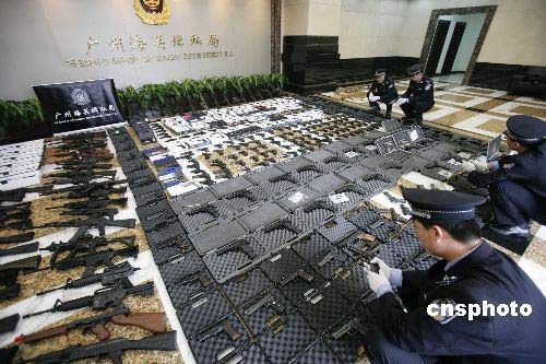 3月21日消息,廣州海關(guān)緝私局宣布,兩年前經(jīng)過艱苦偵查,成功破獲了一個專門從事走私仿真槍的犯罪團(tuán)伙,該起案件案值逾五百萬元人民幣,走私進(jìn)口數(shù)量逾三千支。近日,廣州市中級人民法院對該案作出一審判決:以走私普通貨物罪分別判處譚某等十名被告有期徒刑六年到二年不等。圖為2006年破案后,海關(guān)關(guān)員清點(diǎn)走私仿真槍支。中新社發(fā) 陳國華 攝