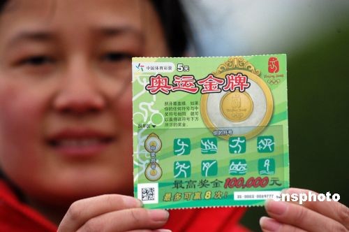 2008年3月23日,山東省濰坊市在該市風(fēng)箏廣場舉辦“奧運彩票與圣火同行”奧運彩票“頂呱刮”首發(fā)儀式。當(dāng)日,奧運彩票“頂呱刮”在濰坊率先上市。據(jù)了解,該奧運彩票為國內(nèi)首創(chuàng)即開即兌型體育彩票。此次上市的奧運即開型體育彩票在技術(shù)、玩法及設(shè)計上均區(qū)別于以往傳統(tǒng)的即開彩票,一張彩票最多有12次中獎機會,最高獎金可達25萬元!绊斶晒巍眾W運體育彩票將于3月24開始在山東、江蘇、浙江、河北四省試點銷售。 中新社發(fā) 王志德 攝