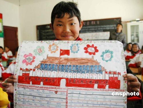 3月27日,拉薩市城關(guān)區(qū)吉崩崗小學(xué)二年級(jí)二班的藏族小學(xué)生吾金拉姆,展示自己在拉薩“3.14”打砸搶燒暴力事件后附有藏漢兩種文字的繪畫作品“祖國(guó)在我心中”。吾金拉姆表示,3月14日,他親眼目睹了暴亂分子的罪惡行徑,隨后創(chuàng)作一這幅圖畫以表達(dá)對(duì)暴亂分子妄圖分裂祖國(guó)的憤怒。中新社發(fā) 周波 攝