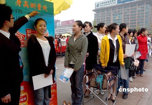 3月29日,中國新空姐招募大匯濟(jì)南選區(qū)在山東濟(jì)南開鑼。主辦方將目測海選賽場設(shè)立在廣場上,讓追逐藍(lán)天夢的女孩子接受市民評(píng)判。僅當(dāng)日上午就有1000多名亮麗女孩前來應(yīng)征。2008中國新空姐招募大匯由中國南方航空公司、中華全國青年聯(lián)合會(huì)、江蘇衛(wèi)視聯(lián)合主辦。依托民航空乘人員專業(yè)考核標(biāo)準(zhǔn),創(chuàng)新引入“民航旅客評(píng)選”制度,旨在打造國內(nèi)最專業(yè)和最具影響力的空姐招聘平臺(tái)。中新社發(fā) 張侃 攝