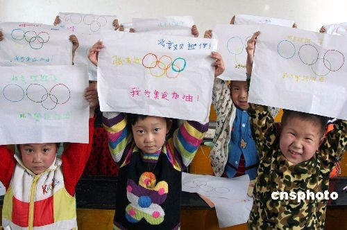 4月7日,邢臺博文幼兒園的小朋友展示自己畫的奧運標(biāo)志。今年以來,該園讓孩子們學(xué)習(xí)奧運、社會和家庭禮儀,訓(xùn)練他們在日常生活中的文明問候、待客等良好習(xí)慣,教育孩子們爭做禮儀小使者,文明奧運宣傳員。 陳雷 攝