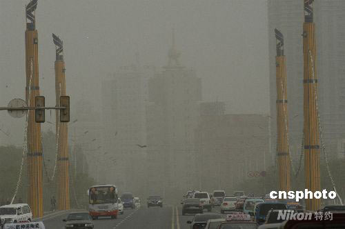 4月23日下午,在新疆庫(kù)爾勒市街頭,汽車在沙塵當(dāng)中行駛。在4月18日--19日遭遇沙塵暴襲擊后,新疆庫(kù)爾勒于23日下午16時(shí)開始,再次遭遇沙塵襲擊。中新社發(fā) 確·胡熱 攝