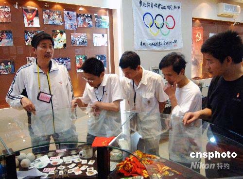 4月29日,福建收藏家、北京奧運(yùn)會(huì)火炬?zhèn)鬟f福州站火炬手張祖仁(左一),在福州舉辦奧運(yùn)體育收藏精品展,共展出包括郵票、錢幣、報(bào)紙、紀(jì)念章、吉祥物、壽山石等奧運(yùn)體育收藏精品五百多件。4月30日是北京奧運(yùn)會(huì)倒計(jì)時(shí)100天。中新社發(fā) 劉可耕 攝