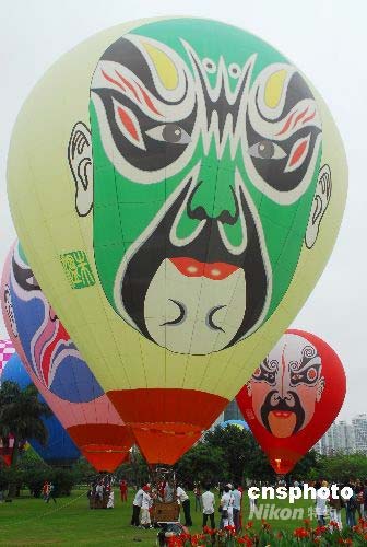 2008年4月28日,來(lái)自全國(guó)各地的40個(gè)熱氣球在?谑腥f(wàn)綠園進(jìn)行系留飛行,供海口報(bào)名參與的2000名市民乘坐體驗(yàn)升空。中新社發(fā) 善平 攝