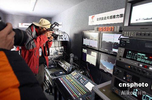 4月30日,采訪2008北京奧運會火炬接力珠峰展示活動的中外媒體記者,集體探訪珠峰大本營,首次進入中國中央電視臺(CCTV)設置在珠峰大本營的電視直播間和電視直播車。中新社發(fā) 盛佳鵬 攝