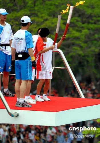 5月10日,六位跳水世界冠軍肖燕娟、林媛霞、李巧賢、池美蘭、蔡玉燕和孫淑偉作為火炬手集體登上中國(guó)跳水隊(duì)汕頭集訓(xùn)基地的十米跳臺(tái),傳遞奧運(yùn)圣火。最后,跳水界模范夫妻孫淑偉和蔡玉燕手持祥云火炬站在十米跳臺(tái)上激情擁吻在一起。 中新社發(fā) 廖攀 攝