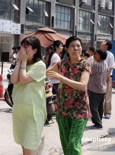 5月12日14時(shí)40分許,重慶各區(qū)縣出現(xiàn)強(qiáng)烈震感,重慶主城的通訊設(shè)施一度不通。據(jù)重慶市地震局局長陳鐵流稱,重慶出現(xiàn)震感是由四川汶川地震波及所致。圖為一名孕婦跑出高樓后驚魂未定。中新社發(fā) 郭晉嘉 攝
