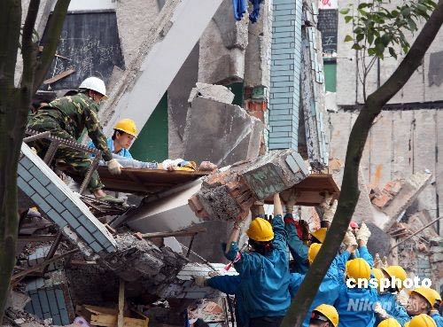 5月13日中午,四川省綿竹市漢旺鎮(zhèn)東方汽輪機(jī)廠子弟學(xué)校——東汽中學(xué)的垮塌校舍里,被困近一天的學(xué)生被救出。12日,四川汶川縣發(fā)生7.8級地震,而漢旺鎮(zhèn)與汶川僅一山之隔,距離30余公里,受到嚴(yán)重破壞。中新社發(fā) 郭晉嘉 攝