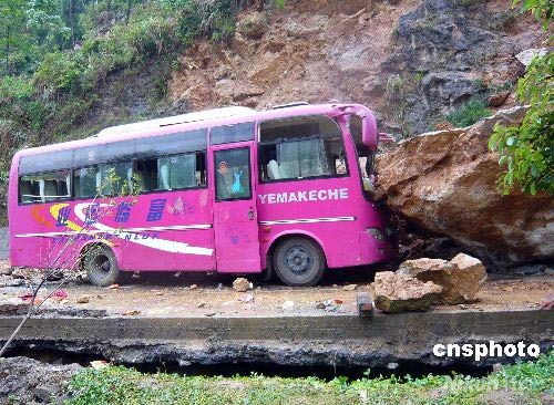 圖:大巴車被巖石擊中車頭嚴(yán)重變形