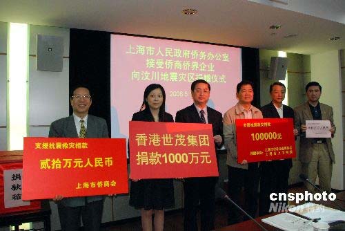5月14日上午,上海僑商僑界企業(yè)向汶川地震災(zāi)區(qū)捐款一千萬余元。其中,上海市僑商會會長、世茂集團(tuán)董事長許榮茂先生以世茂集團(tuán)名義向?yàn)?zāi)區(qū)抗震救災(zāi)捐款1000萬元幫助災(zāi)區(qū)人民度過難關(guān)。在上海僑辦舉行的接受僑商僑界企業(yè)向?yàn)?zāi)區(qū)捐贈儀式上,僑辦領(lǐng)導(dǎo)以及機(jī)關(guān)全體工作人員也向?yàn)?zāi)區(qū)紛紛捐款。中新社發(fā) 王江紅 攝