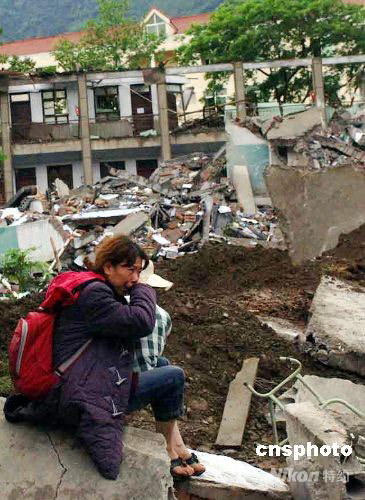 5月14日,在四川地震重災(zāi)區(qū)北川縣,一位學(xué)生家長(zhǎng)坐在廢墟中哭泣。當(dāng)日,營(yíng)救人員正在奮力搜救北川中學(xué)被困學(xué)生。在5·12地震中,該校兩棟5層樓房坍塌。中新社發(fā) 鄒憲 攝