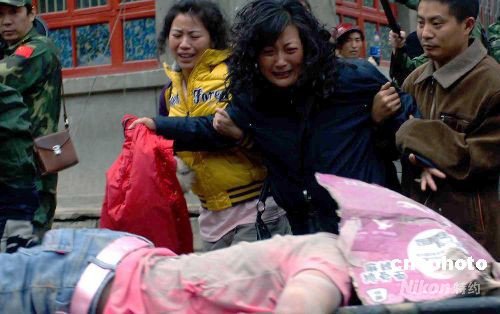 北川縣北川中學將近三千名學生,在四川汶川縣發(fā)生的7.8級地震中僅有大約一半學生生存,另一部分學生遇難或生死未卜。圖為兩日來,大批學生從教學樓廢墟中發(fā)掘出來,一名遇難者的家屬萬分悲痛。中新社發(fā) 鄒憲 攝