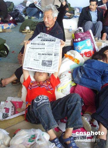 5月15日上午,來自北川地震災(zāi)區(qū)的群眾生活穩(wěn)定,一位小學(xué)生在綿陽市最大的抗震救災(zāi)救助點(diǎn)九州體育館內(nèi)認(rèn)真讀報(bào),了解災(zāi)情。中新社發(fā) 霍潺 攝