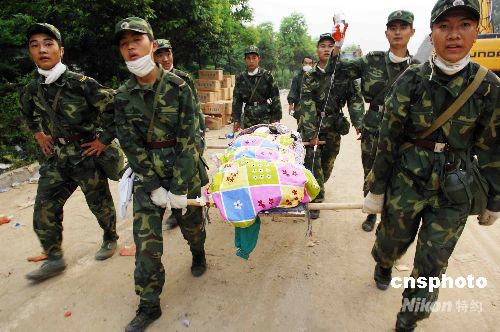 5月16日晨,解放軍某部官兵在地震重災(zāi)區(qū)北川縣茅壩小學搜救出三名幸存小學生。中新社發(fā) 陳文 攝