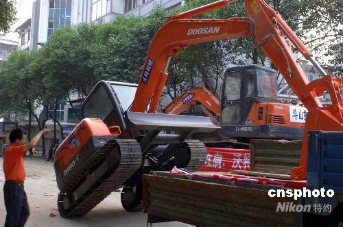 2008年5月15日,地震災(zāi)區(qū)都江堰市危樓排險工作正在進(jìn)行中。目前來自成都市企業(yè)的志愿抗震救災(zāi)隊伍攜帶大型機(jī)械車輛開進(jìn)都江堰市區(qū),與解放軍部隊一起展開危樓居民區(qū)的排險、救災(zāi)、防疫工作。圖為成都市一企業(yè),派數(shù)量可觀的大小挖掘機(jī)和破損機(jī)進(jìn)入江堰市危樓疏散區(qū)。汶川7.8級地震,給都江堰市帶來巨大破壞。目前危樓居民區(qū)疏散、安置工作已展開,取得一定成果。中新社發(fā) 鄒憲 攝