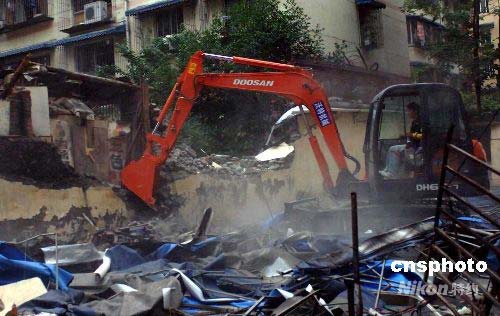 2008年5月15日,來自成都市企業(yè)的志愿抗震救災隊伍攜帶大型機械車輛開到都江堰市區(qū),幫助展開危樓居民區(qū)的排險、救災、防疫工作。汶川7.8級地震,給都江堰市帶來巨大破壞,目前危樓居民疏散、安置工作已展開,取得一定成果。中新社發(fā) 鄒憲 攝