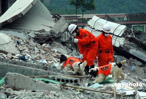 5月15日,四川地震重災(zāi)區(qū)北川縣,重慶消防官兵動(dòng)用搜救犬在北川中學(xué)廢墟中搜尋幸存者。中新社發(fā) 萬(wàn)明 攝