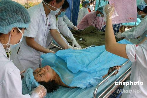 5月16日,成都華西醫(yī)院,來自汶川映秀鎮(zhèn)、什邡、綿竹等災(zāi)區(qū)的重癥傷員不斷轉(zhuǎn)運(yùn)而至,醫(yī)護(hù)人員和志愿者對重癥傷員進(jìn)行精心的醫(yī)護(hù)和救治。中新社發(fā) 楊杰 攝