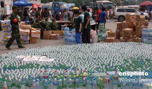 5月中旬, 來(lái)自四面八方的抗震救災(zāi)物資物品正在源源不斷地運(yùn)往四川地震災(zāi)區(qū)。都江堰市一個(gè)災(zāi)民聚集點(diǎn)里,一度趨于緊張的飲用水供應(yīng)已經(jīng)出現(xiàn)好轉(zhuǎn),各種不同品牌的瓶裝水被排列成地震災(zāi)區(qū)的巨大圖形,時(shí)刻警醒著人們。中新社發(fā) 鄒憲 攝
