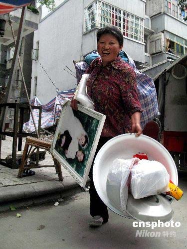 四川都江堰市蒲陽大道兩側(cè)居民建筑在大地震中造成致命性的破壞,已經(jīng)不能住人,不久將要徹底拆除。圖為一名婦女在余震較輕時,冒險(xiǎn)回家取出生活用品,告別家園。中新社發(fā) 鄒憲 攝