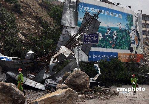 兩名武警搜救隊(duì)員5月17日在映秀鎮(zhèn)通往臥龍的303公路上巡查。5月12日發(fā)生的四川汶川大地震,將映秀鎮(zhèn)通往中國(guó)國(guó)寶大熊貓最主要保護(hù)區(qū)臥龍的303公路幾乎徹底摧毀。有專(zhuān)家稱(chēng),這條公路短期內(nèi)無(wú)法修復(fù)。中新社發(fā) 任晨鳴 攝