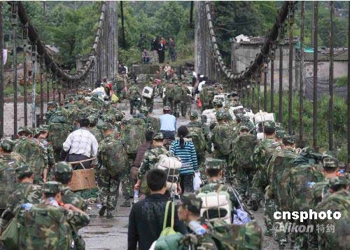 有“鐵軍”稱號的濟南軍區(qū)某集團軍官兵沿岷江向汶川進軍。中新社發(fā) 曾憲平 攝