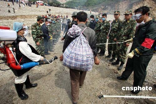 5月18日,醫(yī)療人員在都江堰渡口為從地震災(zāi)區(qū)轉(zhuǎn)移來的民眾消毒防疫。中新社發(fā) 盛佳鵬 攝
