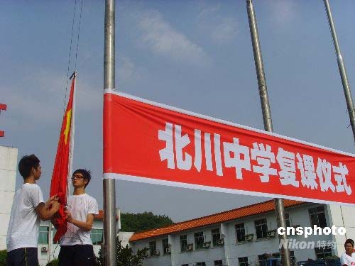 復(fù)課儀式上,五星紅旗在同學(xué)們的國歌聲中冉冉升起,降半旗向地震遇難者致哀。同學(xué)們重新返回課堂,用堅強的意志備戰(zhàn)高考。中新社發(fā) 霍潺 攝