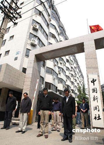5月19日,中國首個全國哀悼日,14點28分,北京全城響起警報聲,中國新聞社總社全體值班員工在社領(lǐng)導(dǎo)率領(lǐng)下,在該社大門口列隊為四川汶川大地震中遇難同胞默哀三分鐘。中新社發(fā) 任海霞 攝