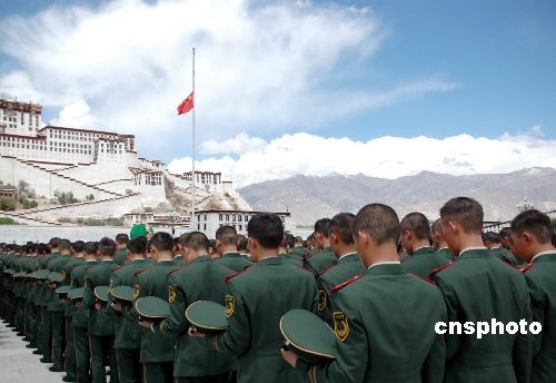 五月十九日下午二時(shí)二十八分,來(lái)自社會(huì)各界的人民群眾、武警官兵上萬(wàn)人,匯集布達(dá)拉宮廣場(chǎng)舉行莊重的肅立默哀儀式,哀悼四川地震中遇難者。中新社發(fā) 周波 攝